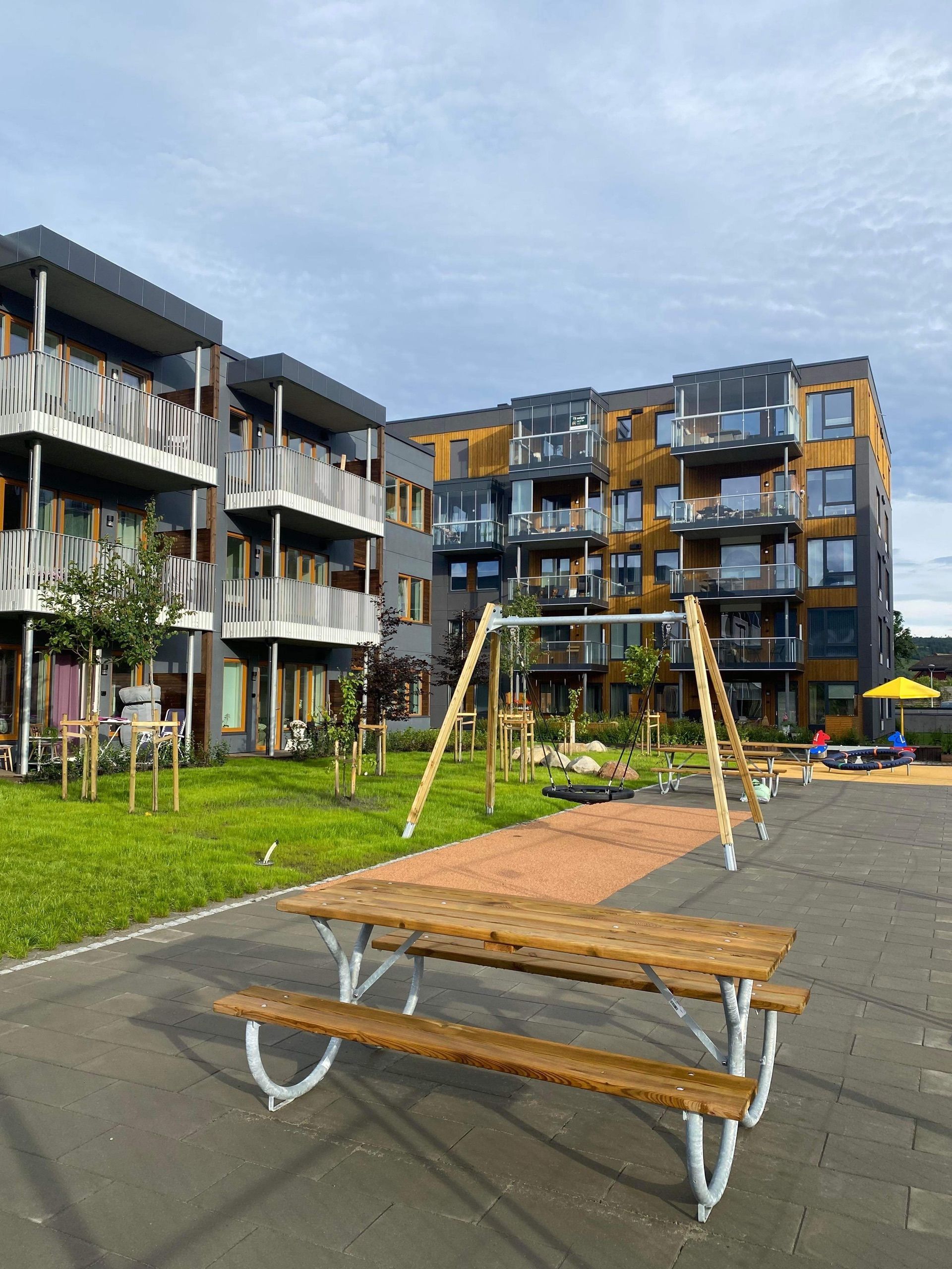 På Melhustunet er uteområdene utformet for å skape trivsel, og sosiale rom med naboene. Den sømløse overgangen mellom fellesområder og private soner skaper gode rammer for uteområdene og boligene.
